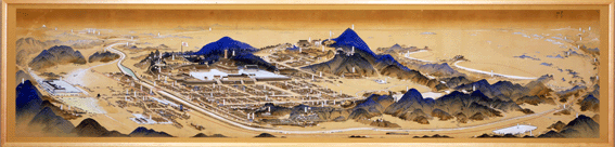 | 本部施設部分 |  | 御霊地金光を北から俯瞰し、吉田初三郎独特のダイナミックな描き方で東は東京や富士山、西は門司さらには釜山までが構図の中に収められている。