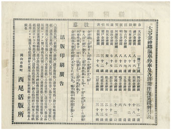 神戸三原間汽車発着時間表(第4191号 表面) 画像をクリックすると拡大します。 | 明治26年4月8日に山陽新報(山陽新聞の前身)の付録として印刷された、1枚刷りのチラシである。