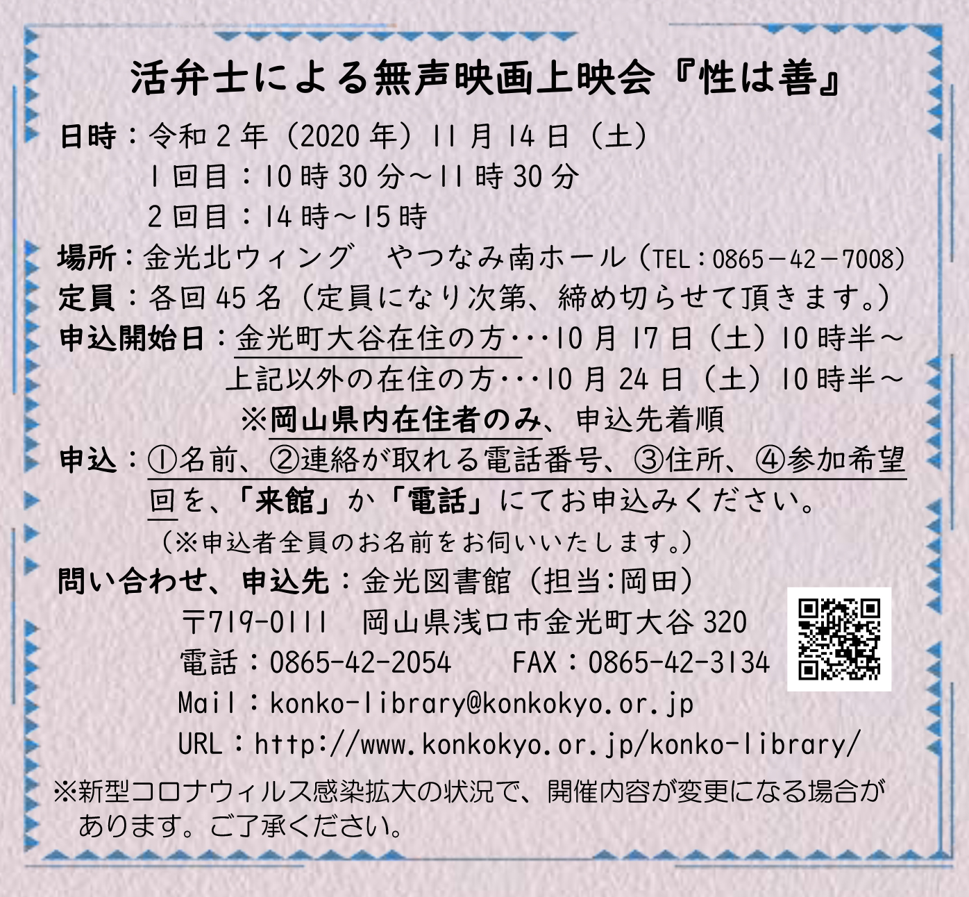 | | 活弁士による無声映画「性は善」の上映会を、11月14日(土)午前10時30分と午後2時から、金光北ウイングにおいて、開催いたします。 なお、申込については、岡山県内在住者のみとし、事前申込制(先着順)としております。詳しくはこちらをご覧ください。また、YouTubeにて同時配信いたします。