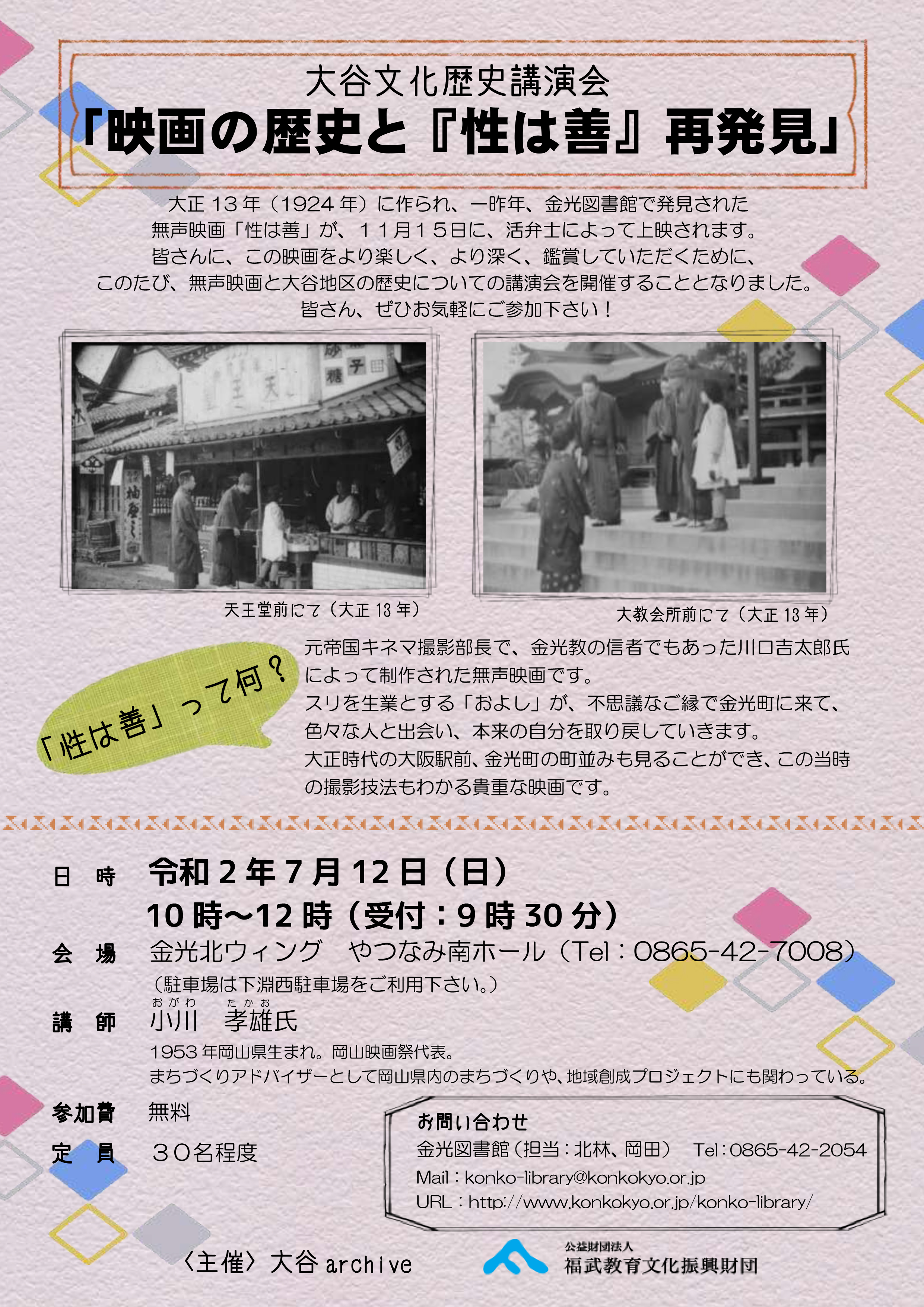 | 2020.6.17 | | 一昨年、金光図書館で発見された無声映画「性は善」(大正13年作製)について、大谷文化歴史講演会「映画の歴史と『性は善』再発見」として、7月12日(日)金光北ウイングやつなみ南ホールにおいて、講演会を開催いたします。入場無料・定員は30名程度の予定です。 なお、このため、金光図書館は午前中休館し、午後1時半より開館いたします。