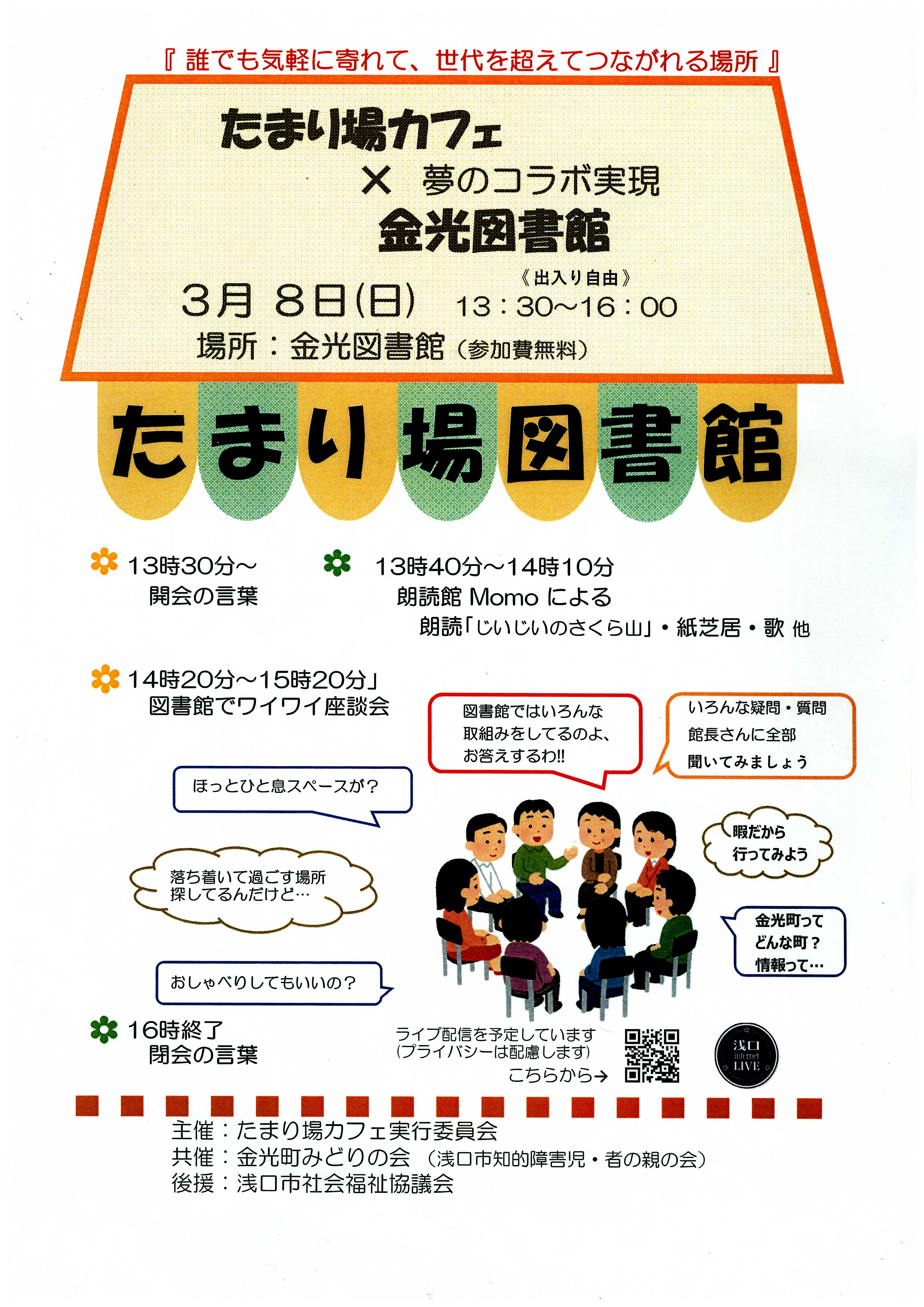 | 2020.2.21 | | 金光図書館2階児童コーナーのフリースペースにおいて、3月8日(日) 13時30分から16時までの予定で、たまり場カフェ実行委員会による「たまり場図書館」が行われます。内容は、朗読館Momoによる朗読・紙芝居・歌等と、図書館でワイワイ座談会となっております。 |